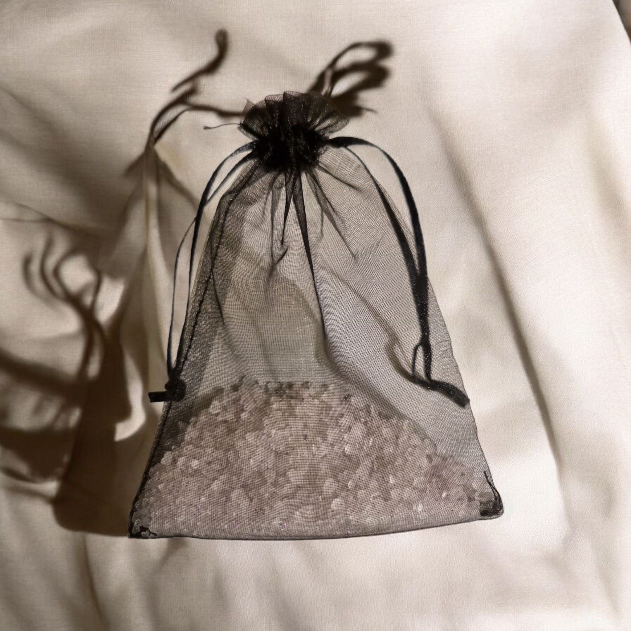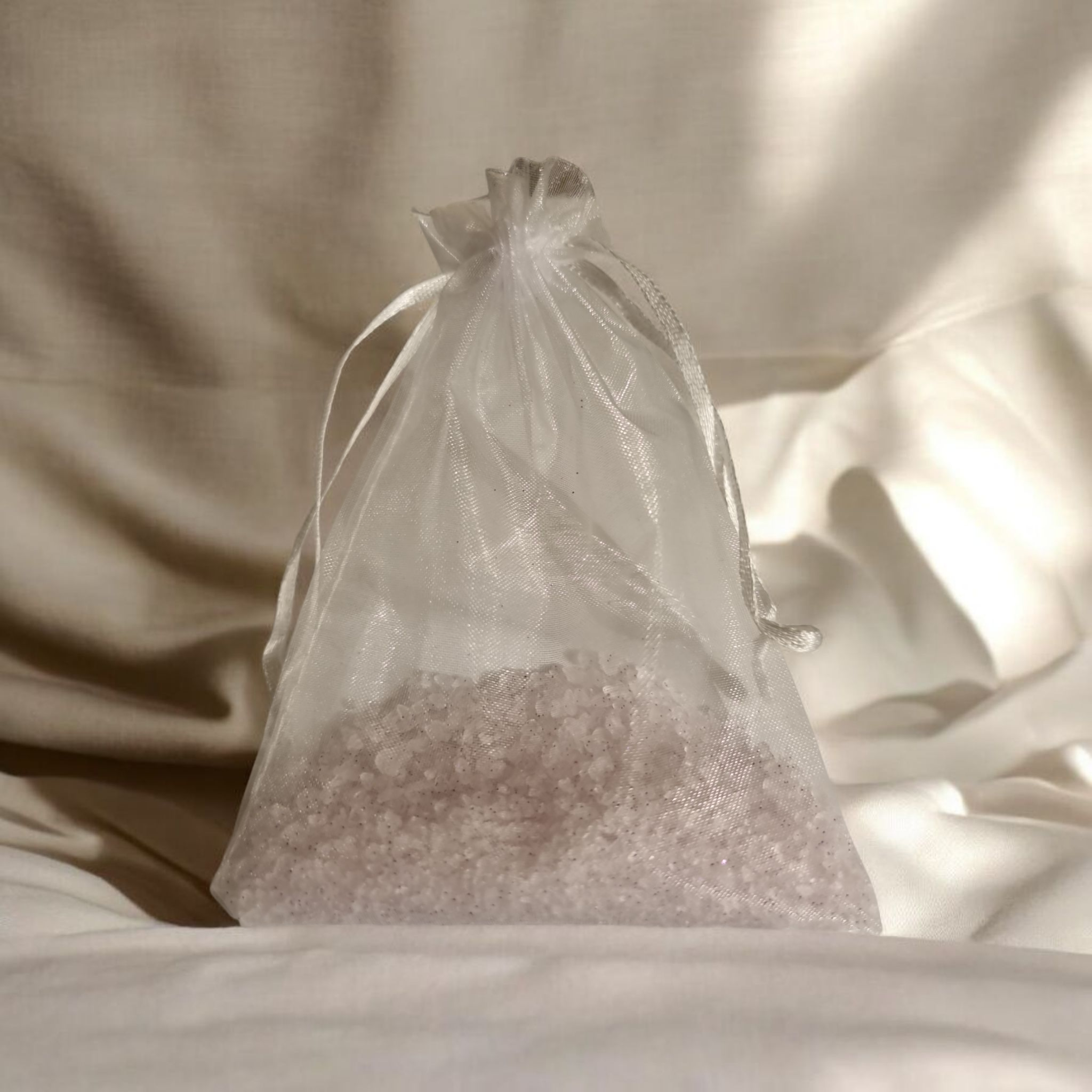 Beschrijving: Lichtpaarse geurkorrels verpakt in een elegant organza zakje. Perfect voor gebruik in de kast, het toilet, de auto of in huis.