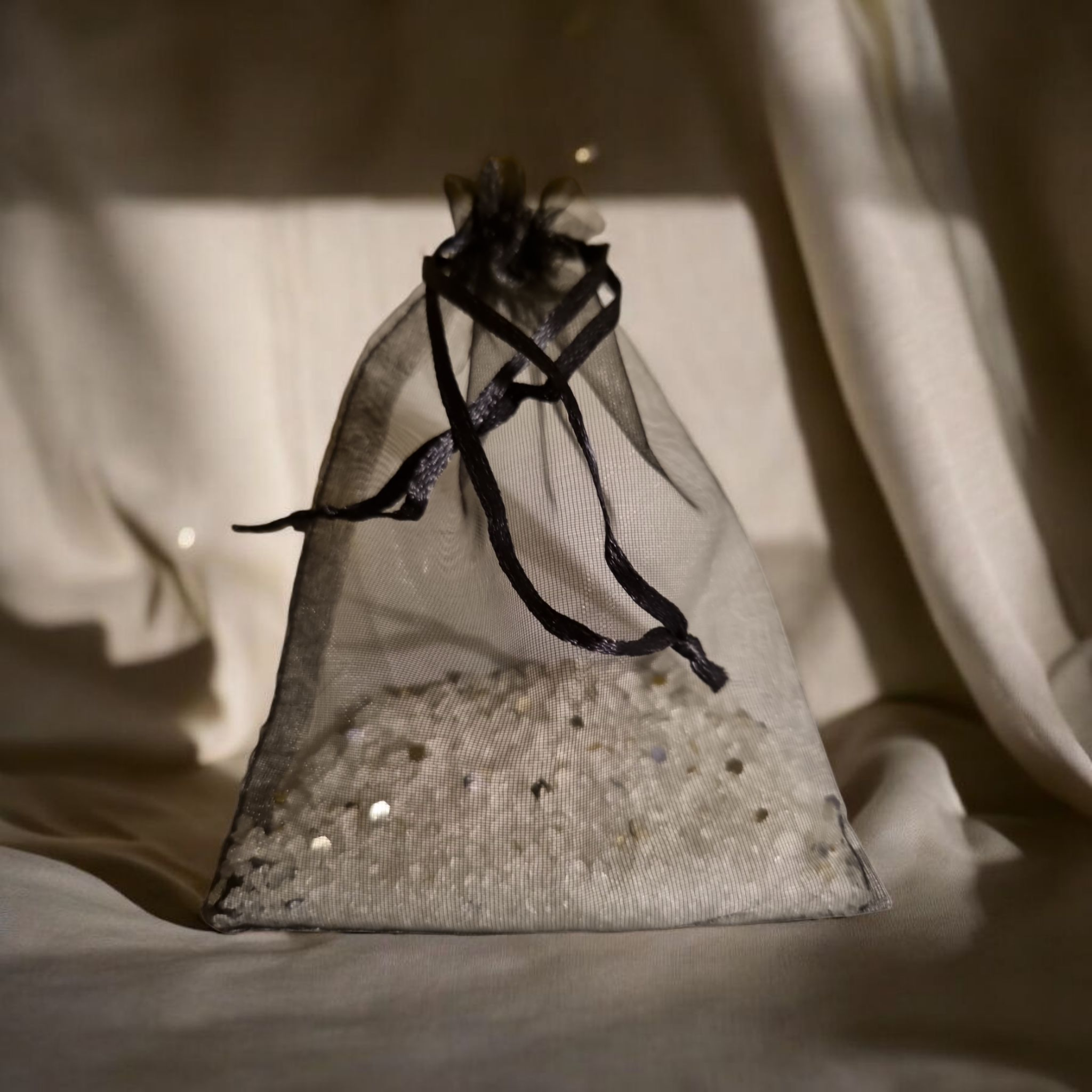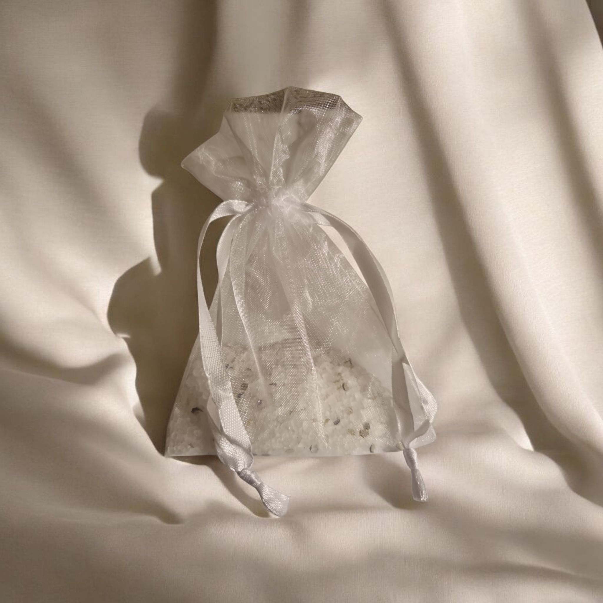 Beschrijving: Witte geurkorrels met subtiele zilveren glitters, verpakt in een elegant organza zakje. Perfect voor gebruik in de kast, het toilet, de auto of in huis.