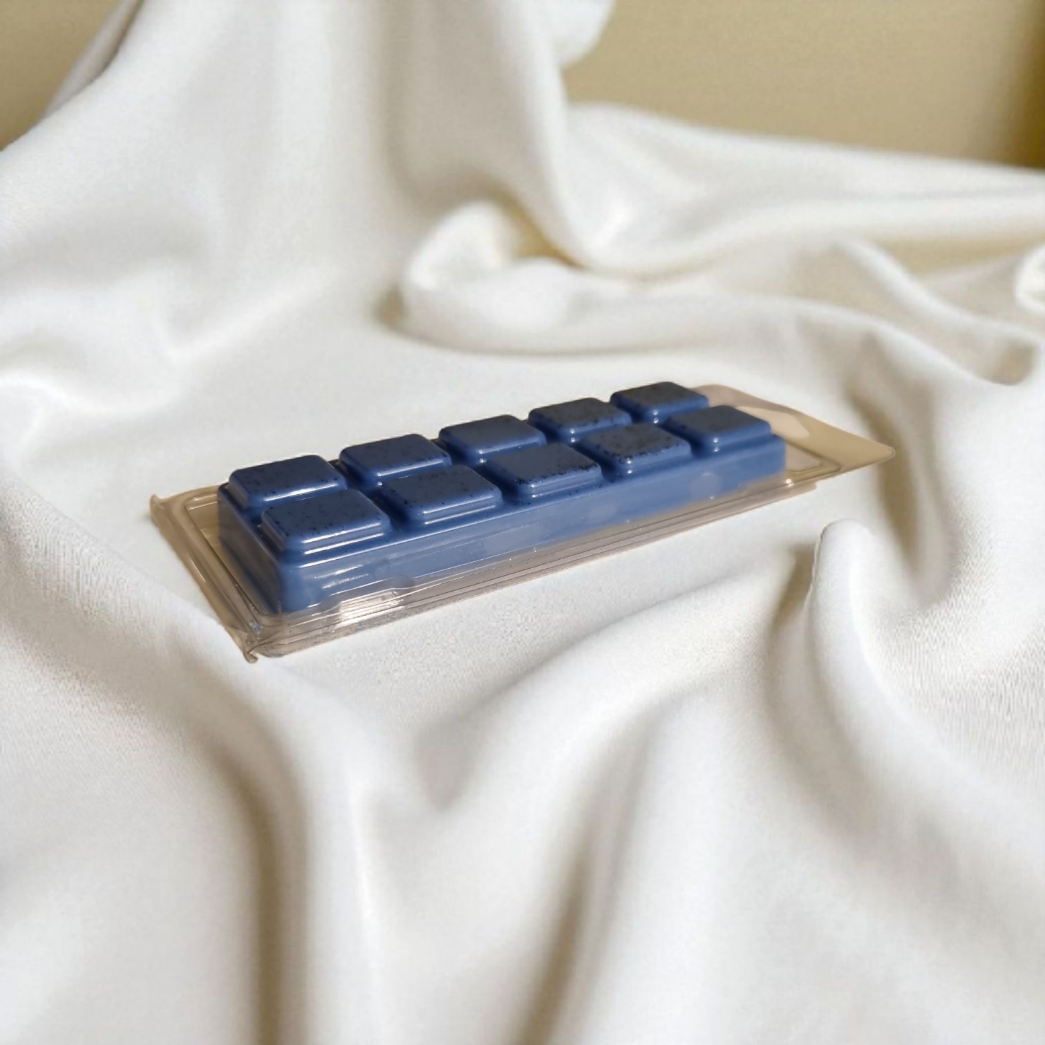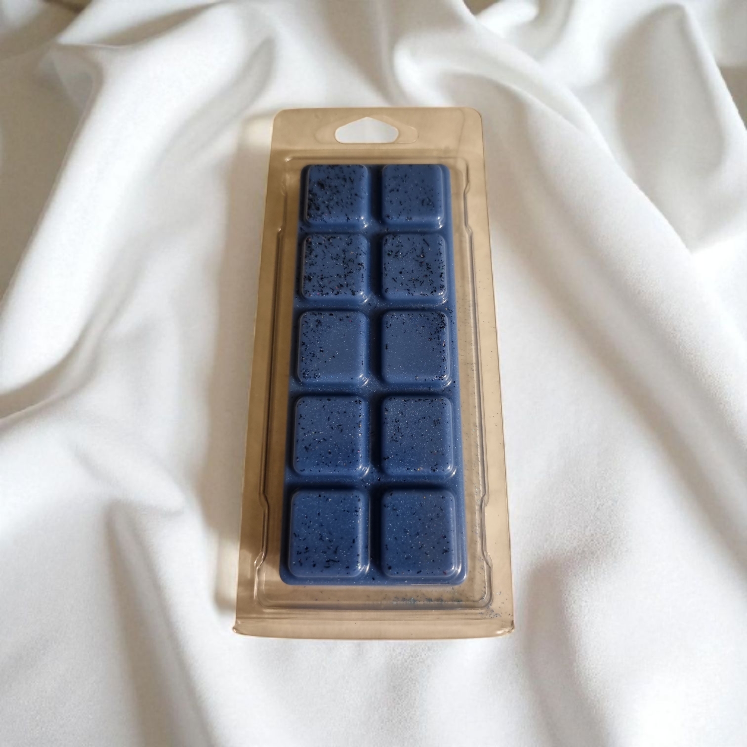 Blauwe waxmelts met subtiele zwarte glitter voor een stijlvolle en mysterieuze uitstraling.
