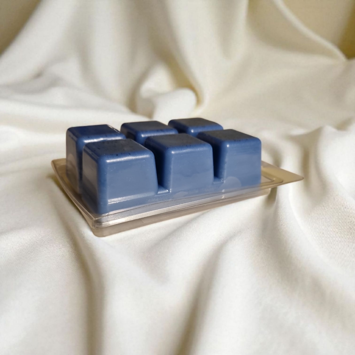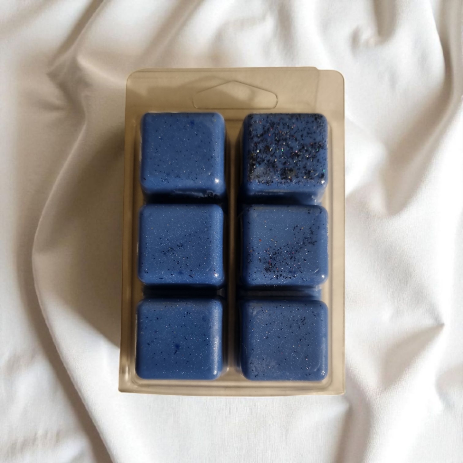 Diepblauwe waxmelts met subtiele shimmer en fijne donkere glitterdeeltjes voor een mysterieuze en stijlvolle uitstraling.