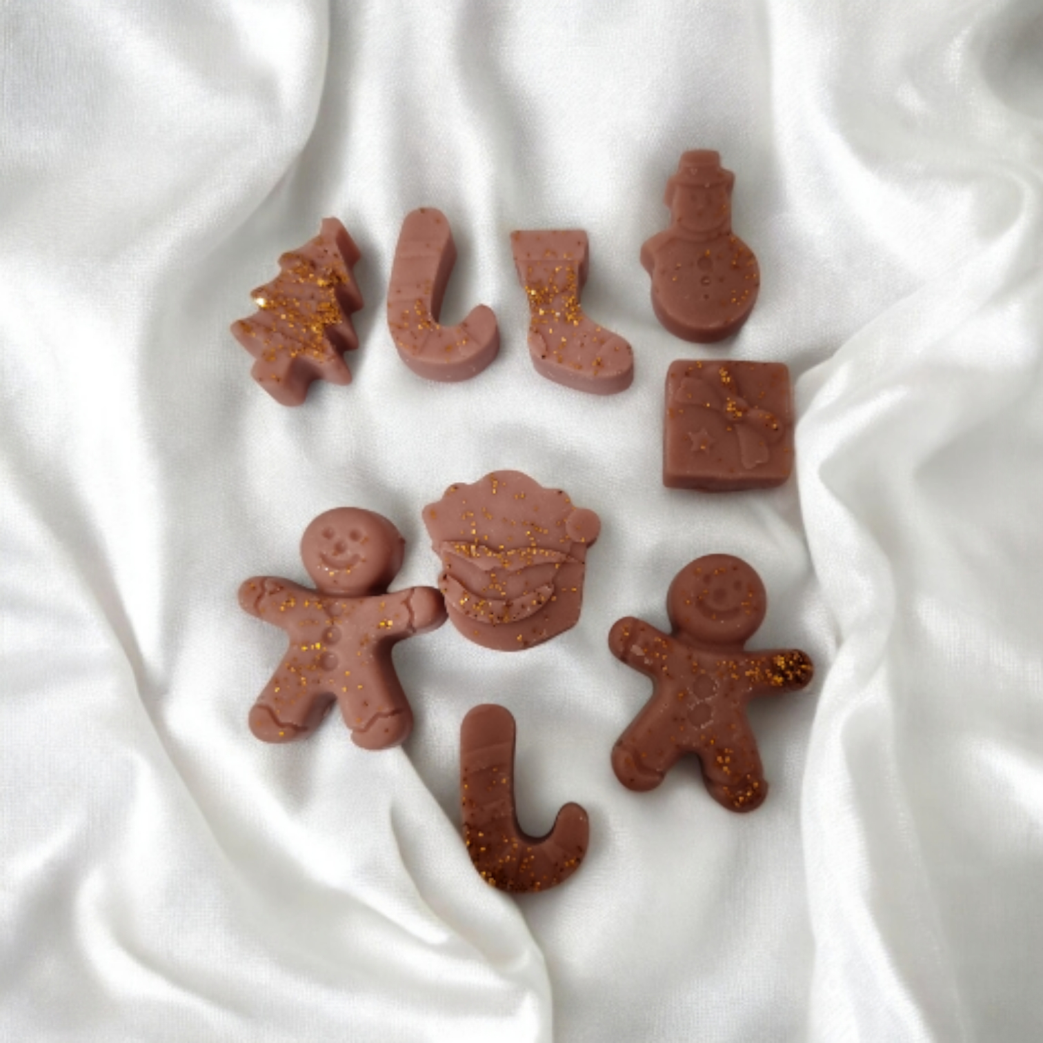 Handgemaakte mini kerstfiguurtjes met de rijke geur van tabak, cognac en eikenhout. Luxe winterse waxmelts in vormpjes zoals gingerbread, kerstboom, cadeautje, sneeuwpop en candy cane.