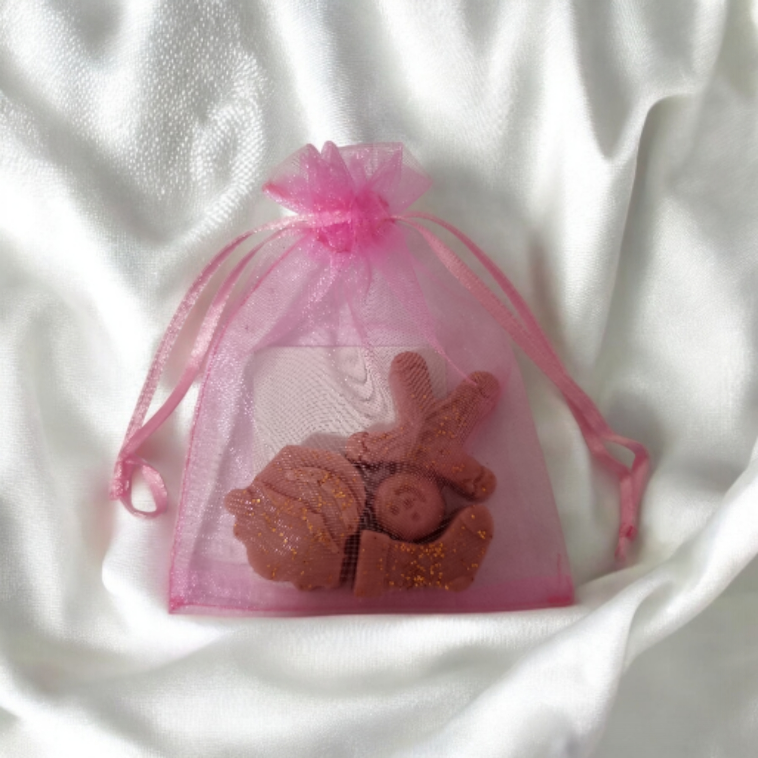 Kleur & afwerking: Warm bruine kerstfiguurtjes met fijne gouden glitter in organzazakje.
