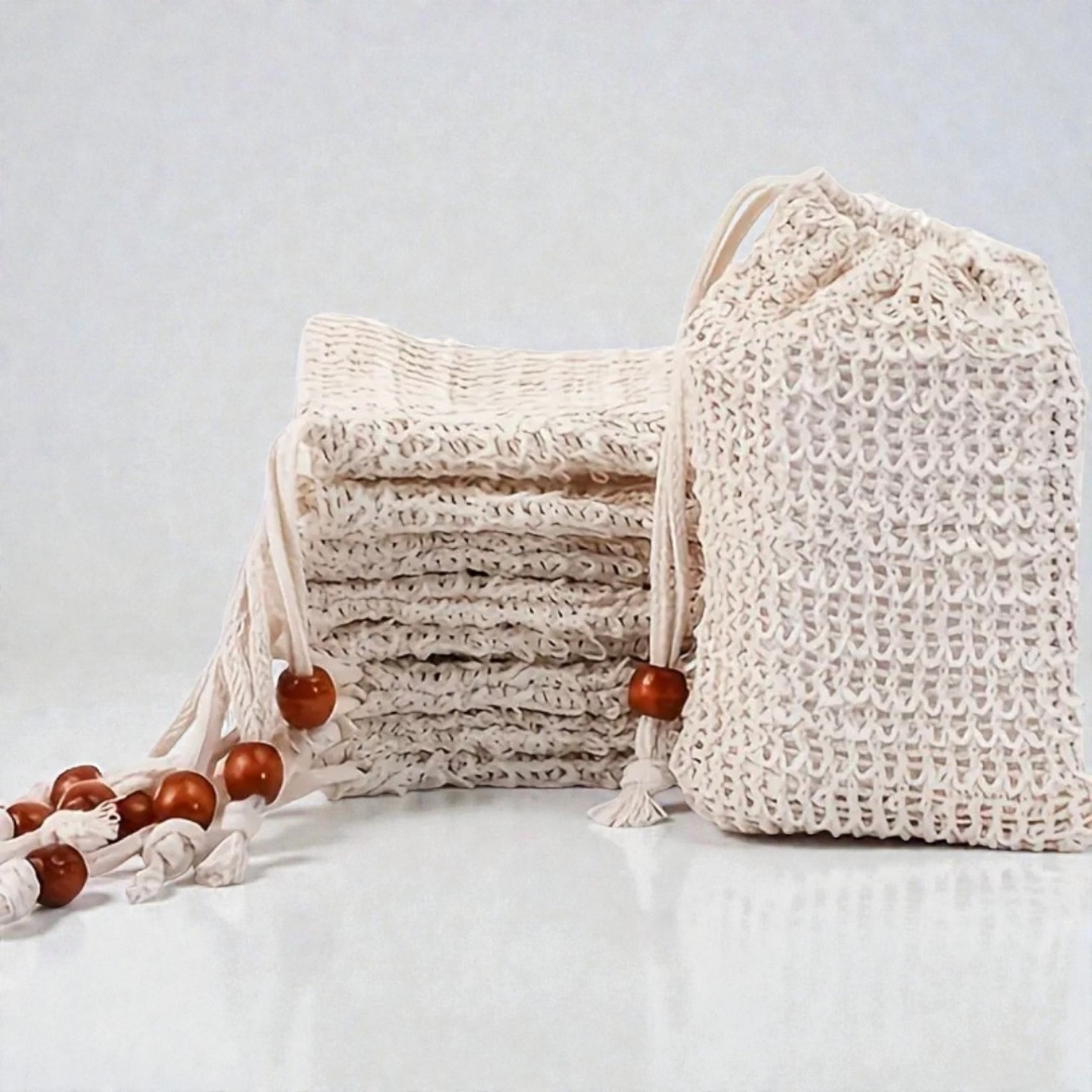Herbruikbare katoenen zeepzak (zoals afgebeeld). Ideaal voor extra schuim en een zacht scrubeffect onder de douche.