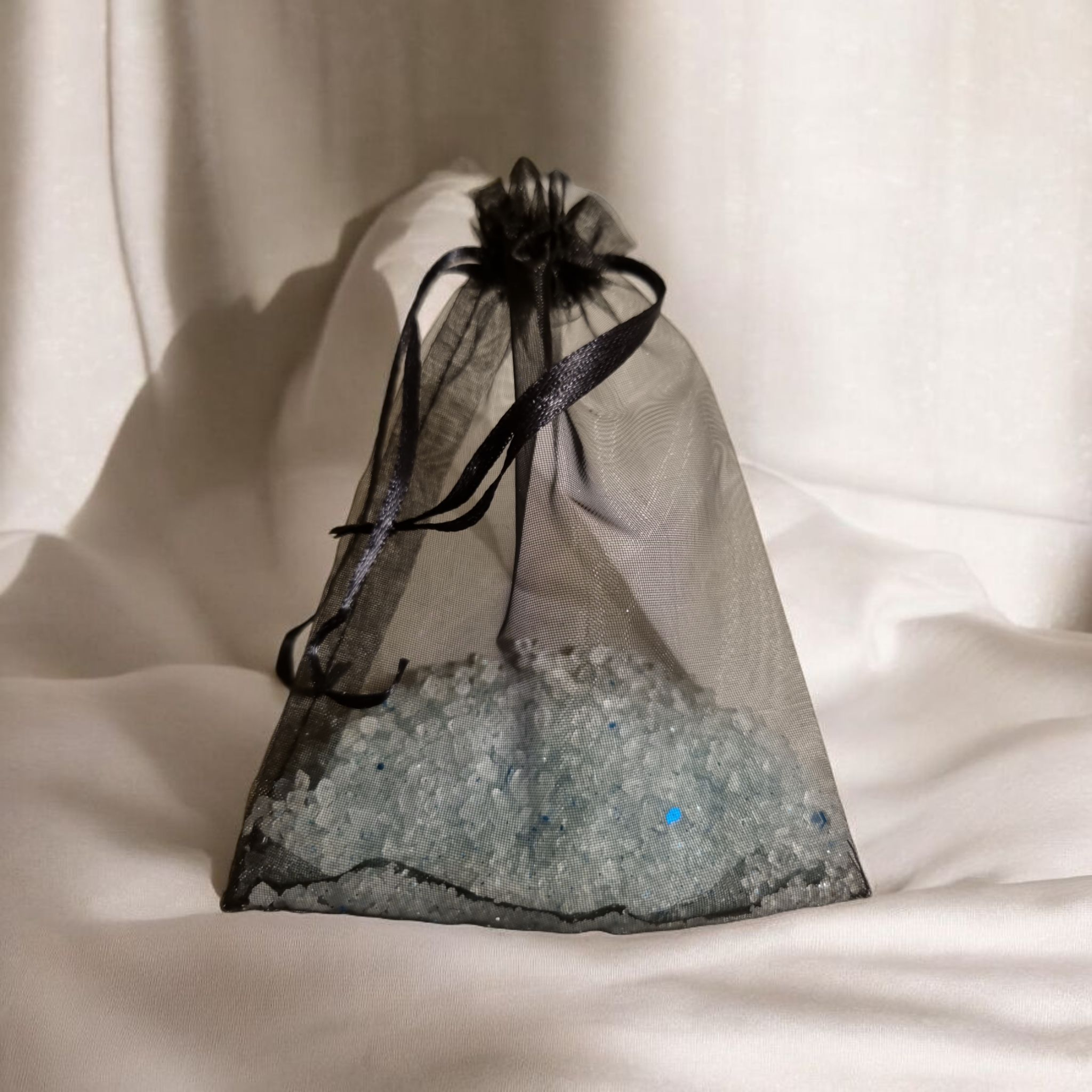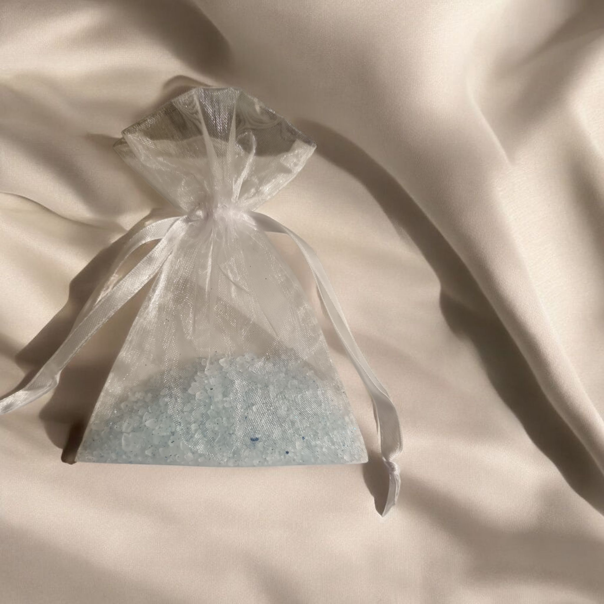 Beschrijving: Lichtblauwe geurkorrels, verpakt in een elegant organza zakje. Perfect voor gebruik in de kast, het toilet, de auto of in huis.
