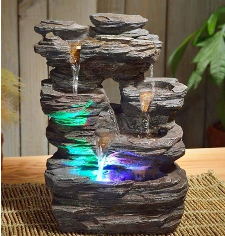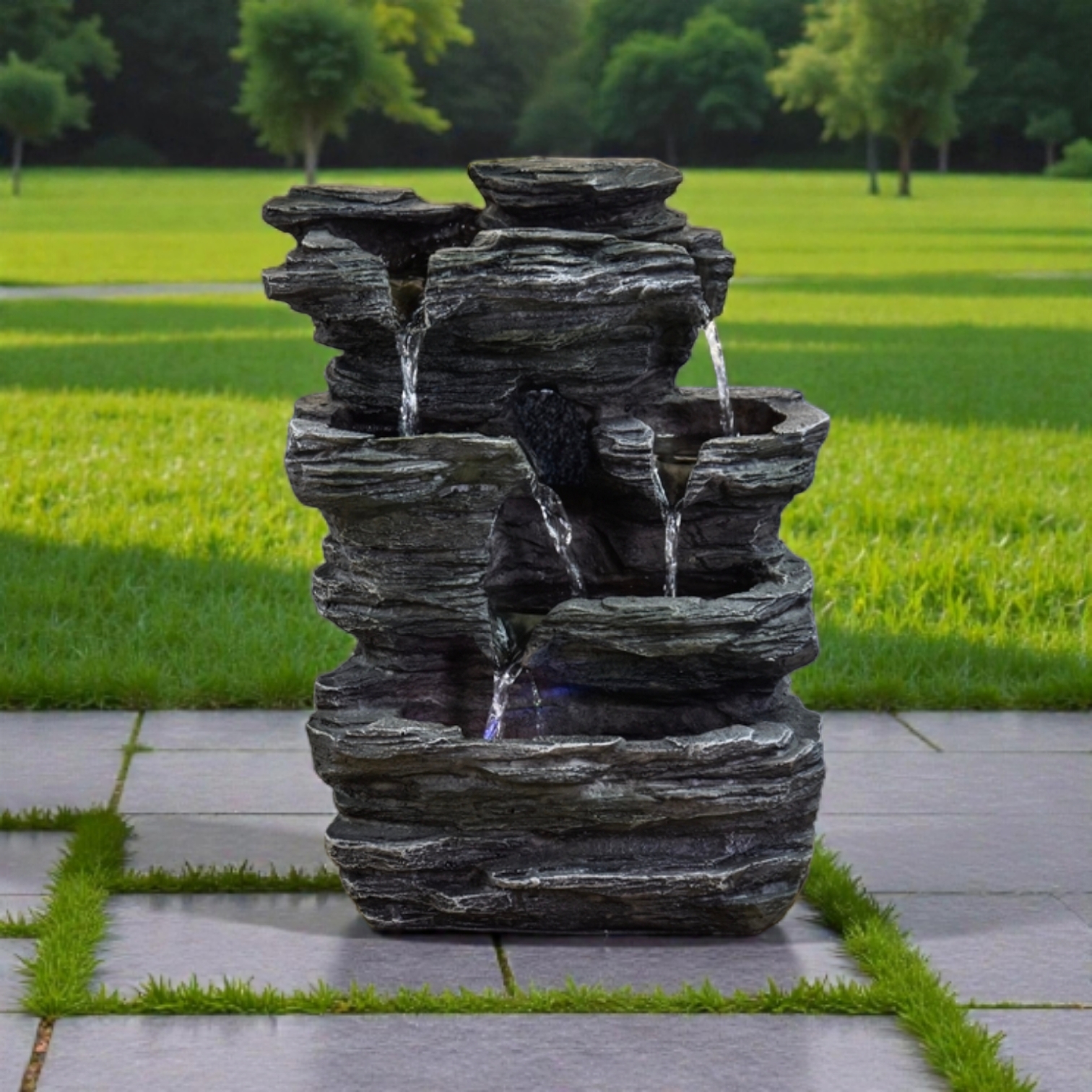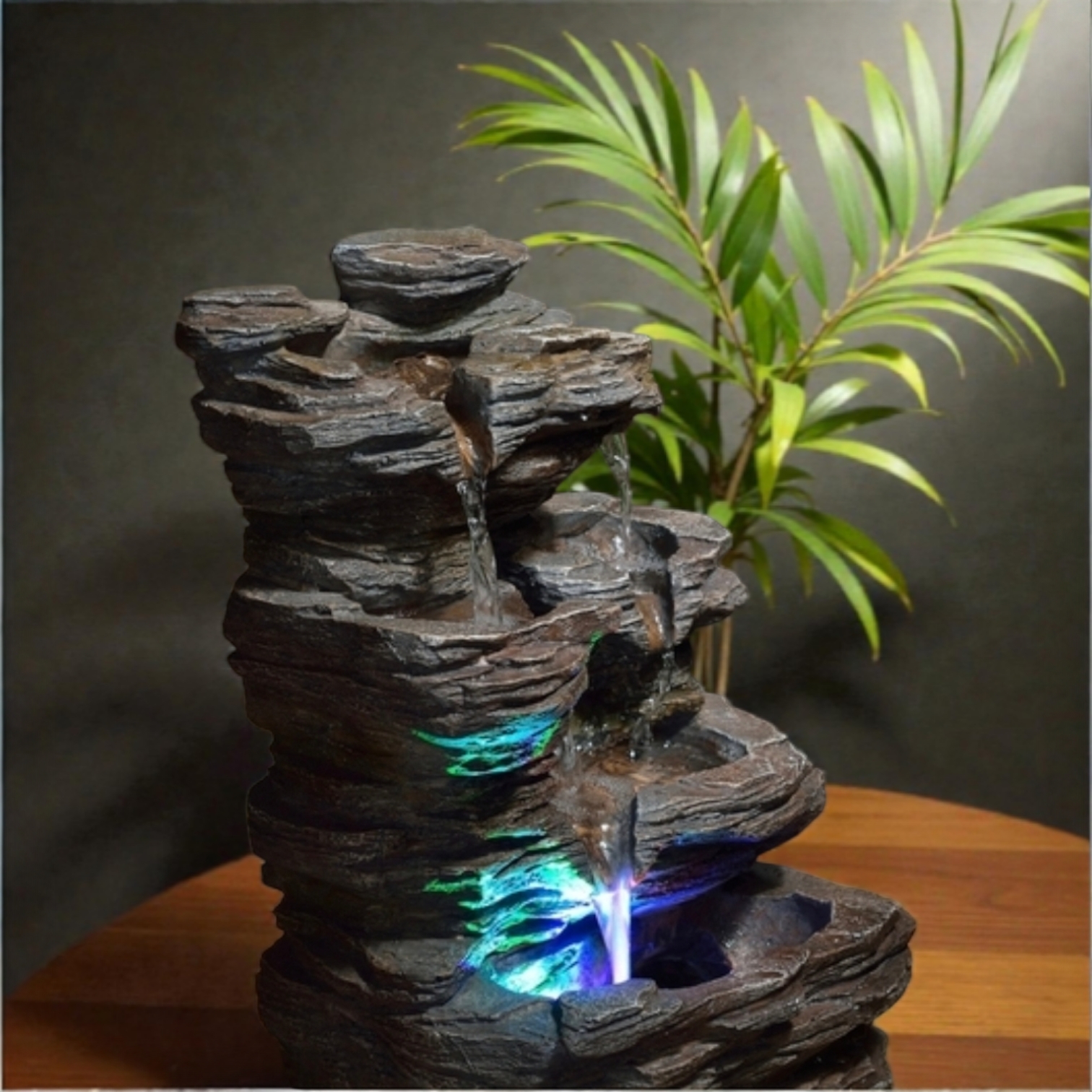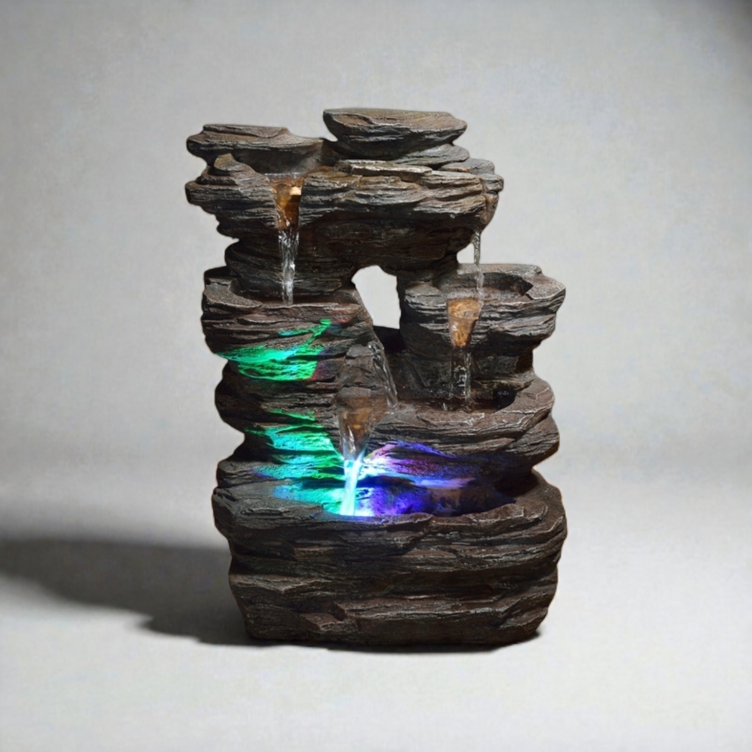 Tijdens gebruik geniet je van het kalmerende geluid van stromend water, terwijl de kleurveranderende LED-verlichting het water subtiel verlicht en het reliëf van de rotsstructuur extra accentueert. De stille pomp zorgt ervoor dat de fontein zijn rustgevende werking behoudt zonder storende geluiden. De natuurgetrouwe steenimitatie, uitgevoerd in duurzame hars, geeft de fontein een realistische en luxe uitstraling.