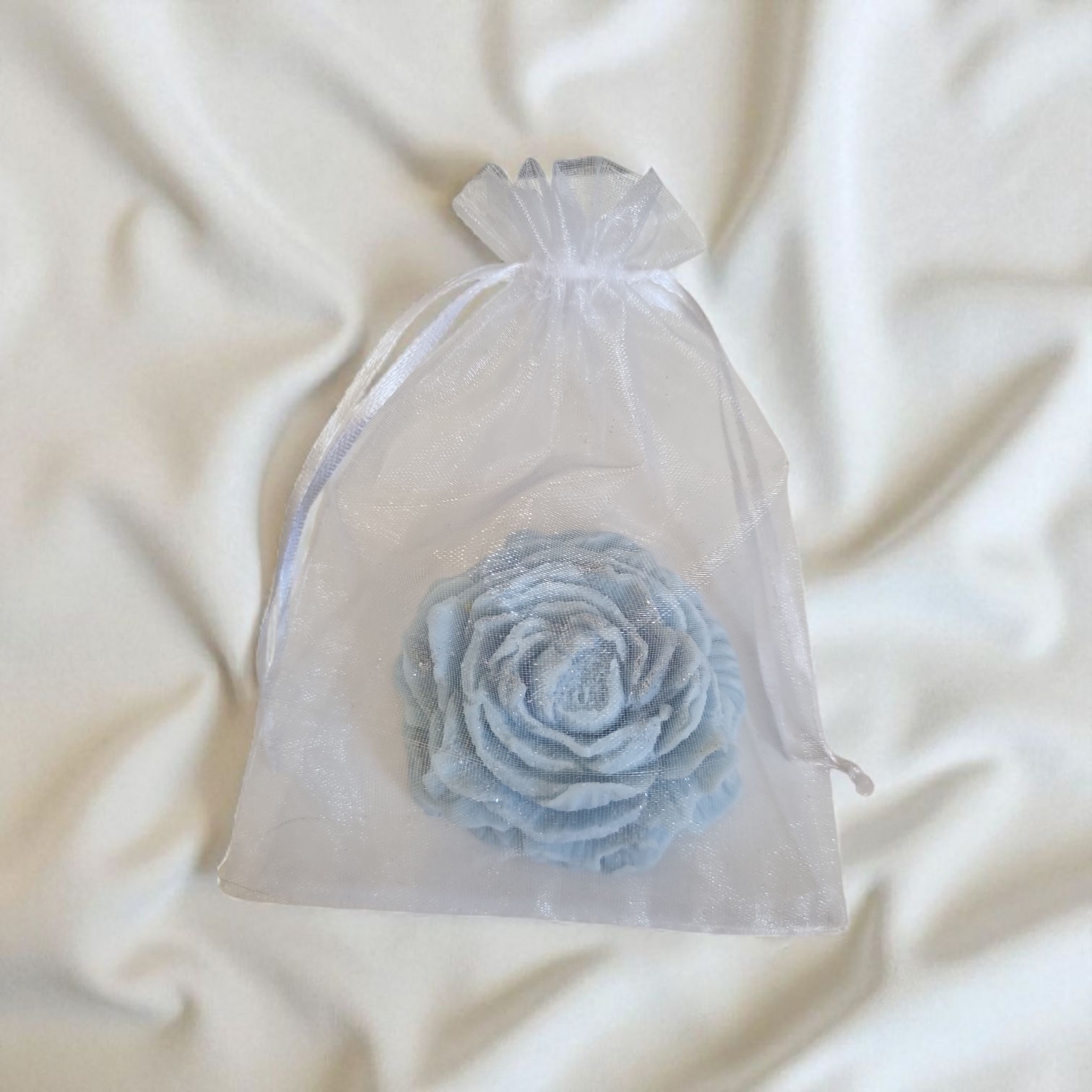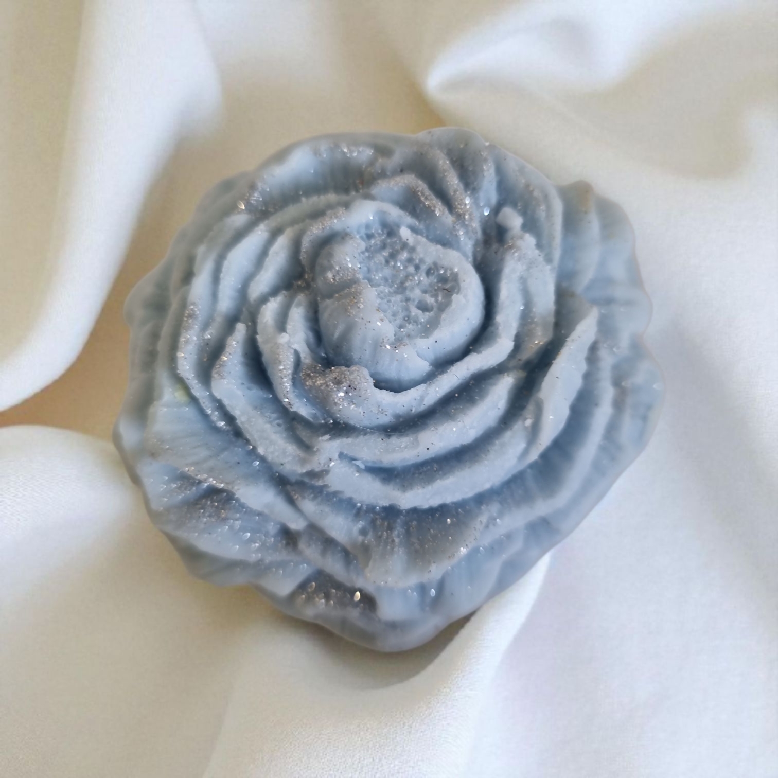 Lichtblauwe roos waxmelt met subtiele zilveren glitteraccenten voor een elegante en luxe uitstraling