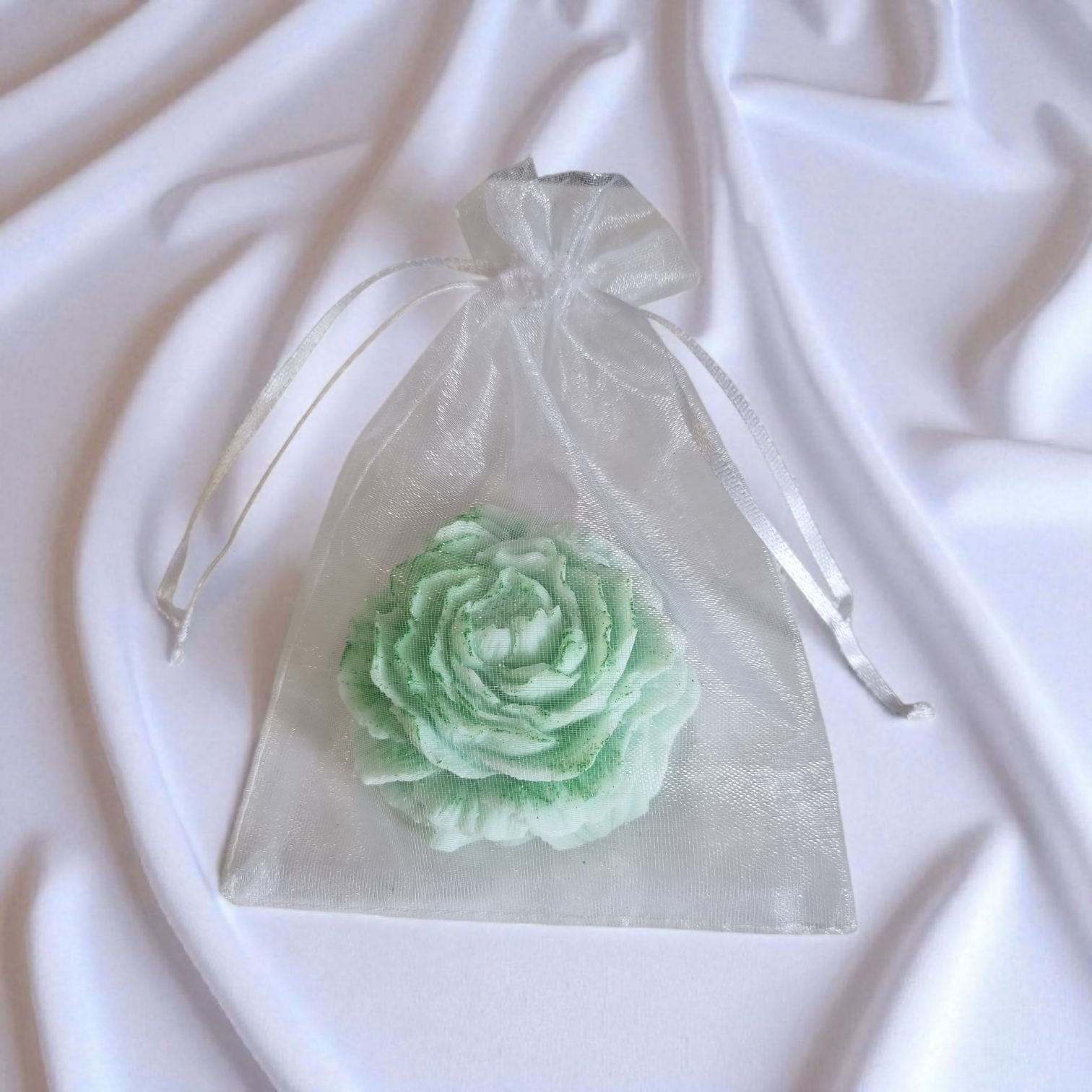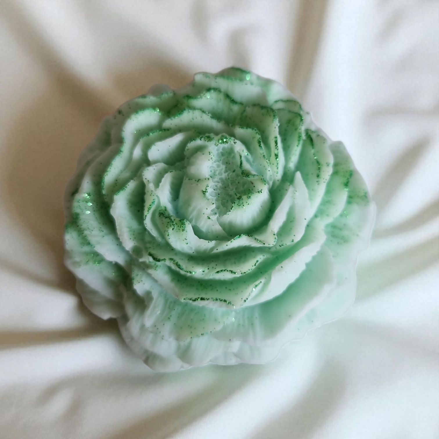 Groene roos, afgewerkt met subtiele glitters die een mooie glans geven tijdens het smelten